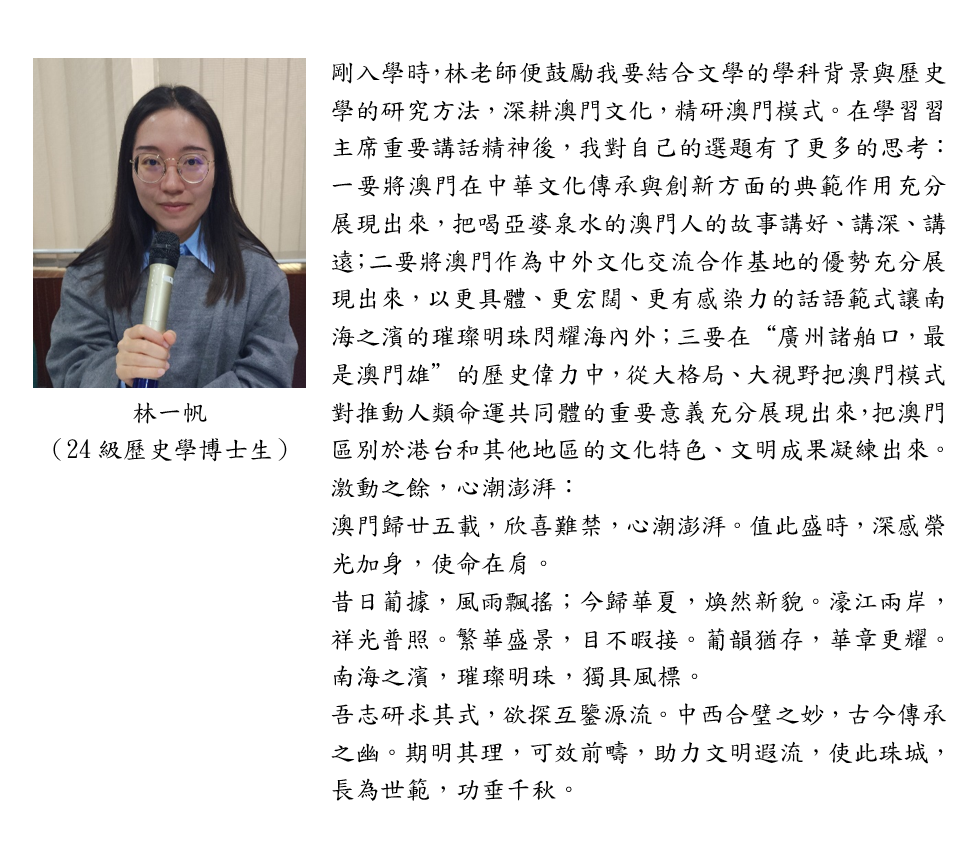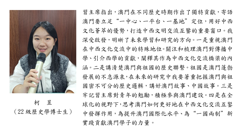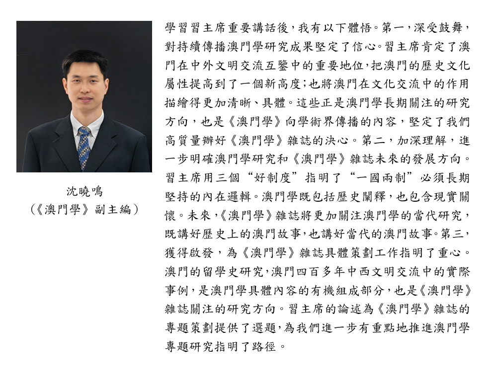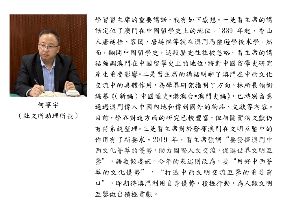 習主席指出,“中國最早一批留學生從這裡走向世界,不少中華經典在這裡經翻譯傳到西方,西方近代科學、技術、文化不少經澳門傳入中國內地。在不同歷史時期,澳門都扮演著重要角色,作出了獨特貢獻。”中心常務副主任、社文所所長林廣志教授體會到,習主席充分肯定澳門不同歷史時期在中西文化交流中的地位、作用和貢獻,並對今後澳門在國家對外開放中發揮應有的作用提出了新目標、新要求和新路徑。我們要在澳門歷史文化、以容閎、唐廷樞、鄭觀應為代表的香山文化和以中外文明互鑒為對象的澳門學研究基礎上,用好中西薈萃的文化優勢,促進國際人文交流,講好澳門故事、中國故事,為打造中西文明交流互鑒的重要窗口做出新的貢獻。