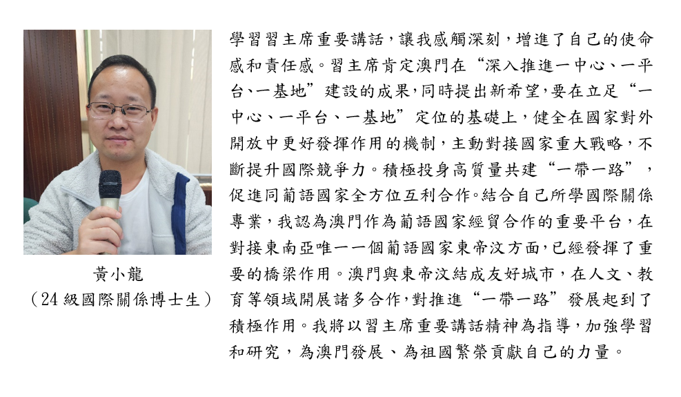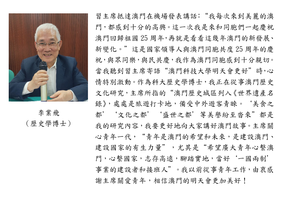 12月19日上午,習近平主席蒞臨澳門科技大學視察,充分肯定澳科大辦學成就,並寄予殷切期待,全校師生和廣大校友備受鼓舞,沉浸在喜悅和激動的氛圍中。20日上午,中國歷史研究院澳門歷史研究中心、澳門科技大學社會和文化研究所組織師生收聽收看習近平主席在慶祝澳門回歸祖國25周年大會暨澳門特別行政區第六屆政府就職典禮上的重要講話,並舉辦線上線下學習座談會。