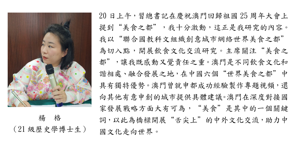 與會者圍繞“一中心、一平台、一基地”建設、澳門在中國留學史上的地位、澳門在中西文化交流和文明互鑒中的作用、“澳門歷史城區”、“美食之都”、澳門青少年等展開討論。與會者認為,習主席充分肯定了澳門在歷史上的重要地位和作用,肯定了“一中心、一平台、一基地”建設成果明顯,肯定了澳門歷史文化建設取得的成果。習主席重視澳門歷史文化,多次提及發揮澳門中西薈萃的文化優勢,促進中外文明互鑒。